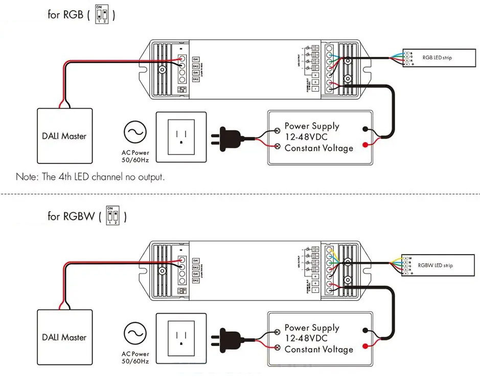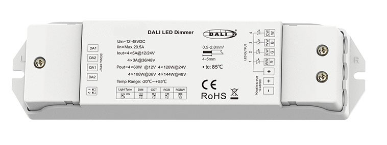 4CH, DALI to RGBW - 4CH, Ovladač pro RGBW LED pásky, vstup 12-24V 20,5A, 5A/ch, 4x60W/12V, 4x120W/24V, 36-48V 3A/ch, 4x144W/48V, stmívatelný DALI/PWM 2kHz, nebo 8kHz, IP20, rozměry 175x45x27mm