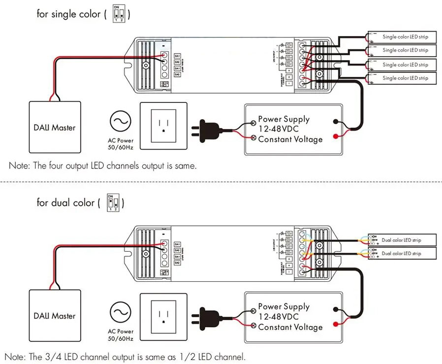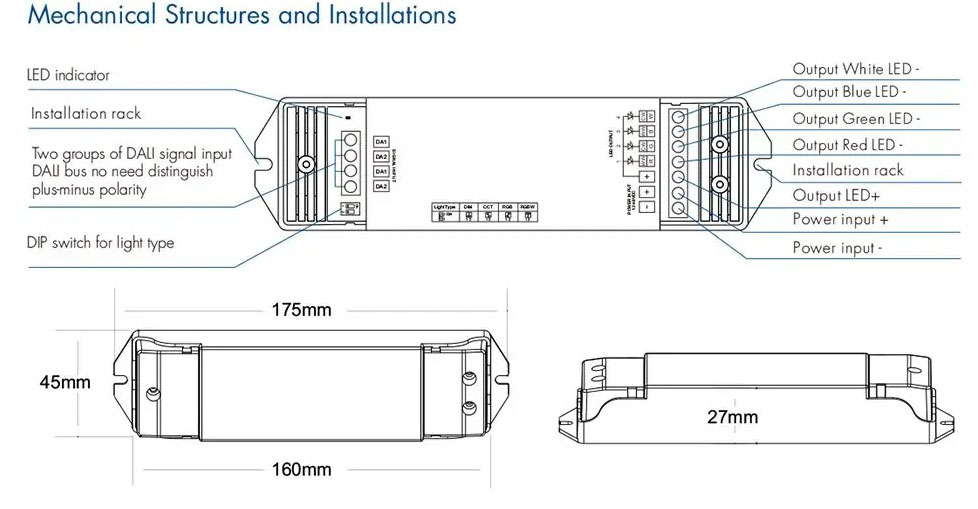 | Výhodné vlastnosti | Pomocí DIP přepínače lze použít jako jednokanálový stmívač, nebo stmívač a nastavení teploty světla CCT, nebo stmívání a řízení RGBW barevných LED psáků a svítidel |