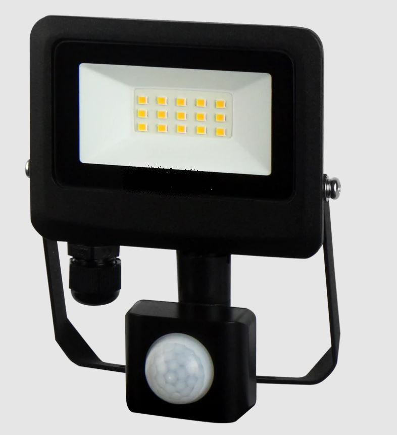 Venkovní reflektor, PIR senzor pohybu, dosah 0,5-8m, čas 10s-8min, těleso hliník, povrch černá, krycí sklo čiré, LED 10W/20W/30W/50W/100W, neutrální 4000K/denní 6000K, vyzař. úhel 120°, 230V, IP65, rozměry dle typu.