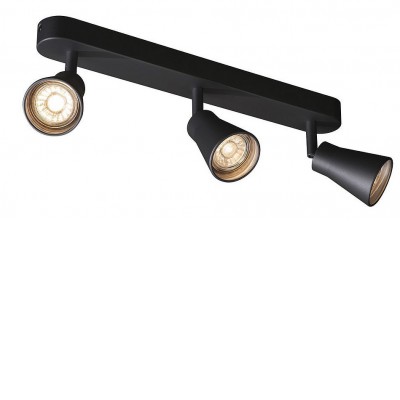 Nástěnné nebo stropní bodové svítidlo, nastavitelný směr svícení, těleso ocel, povrch černá/bílá/šedá, pro žárovku 3x50W, GU10, 230V, IP20, tř.1, rozměry tělesa 400x115x95mm, rozměry hlavice d=62mm.