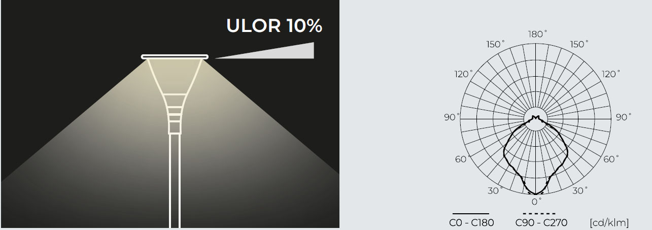 | Nízké světelné znečištění ULOR 10% – optika v kombinaci s tvarem svítidla výrazně snižuje emise světla směrem nahoru. | |
