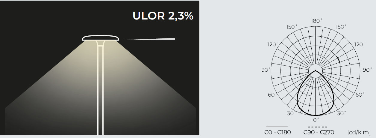 | Výhodné vlastnosti | Žádné světelné znečištění (světelný smog) – svítidlo má faktor ULOR 2,3 %, což znamená žádné oslnění ani ztrátu světla. |