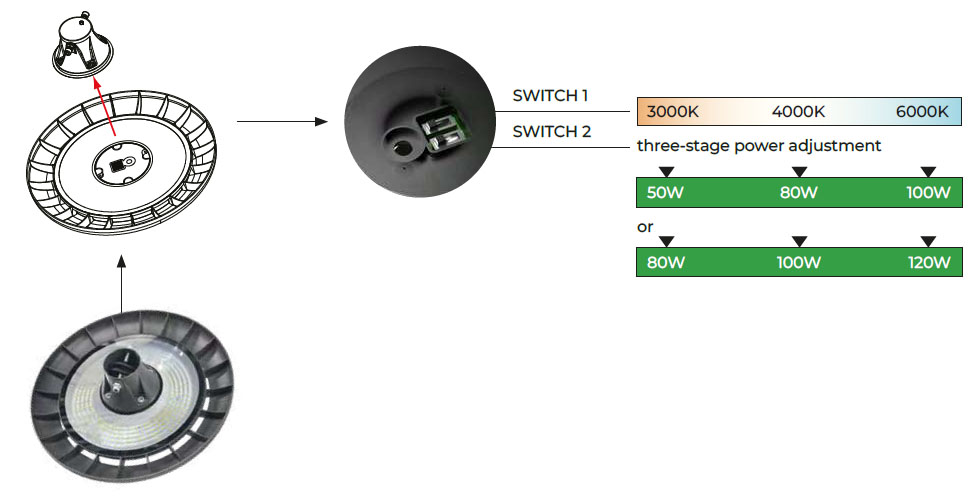 | Výhodné vlastnosti | CCT pomocí přepínače uvnitř svítidla, lze přepínat teplotu světtla teplá 3000K neutrální 4000K, denní 5000K. Pomocí přepínače uvnitř svítidla, možnost přepínání příkonu svítidla. |