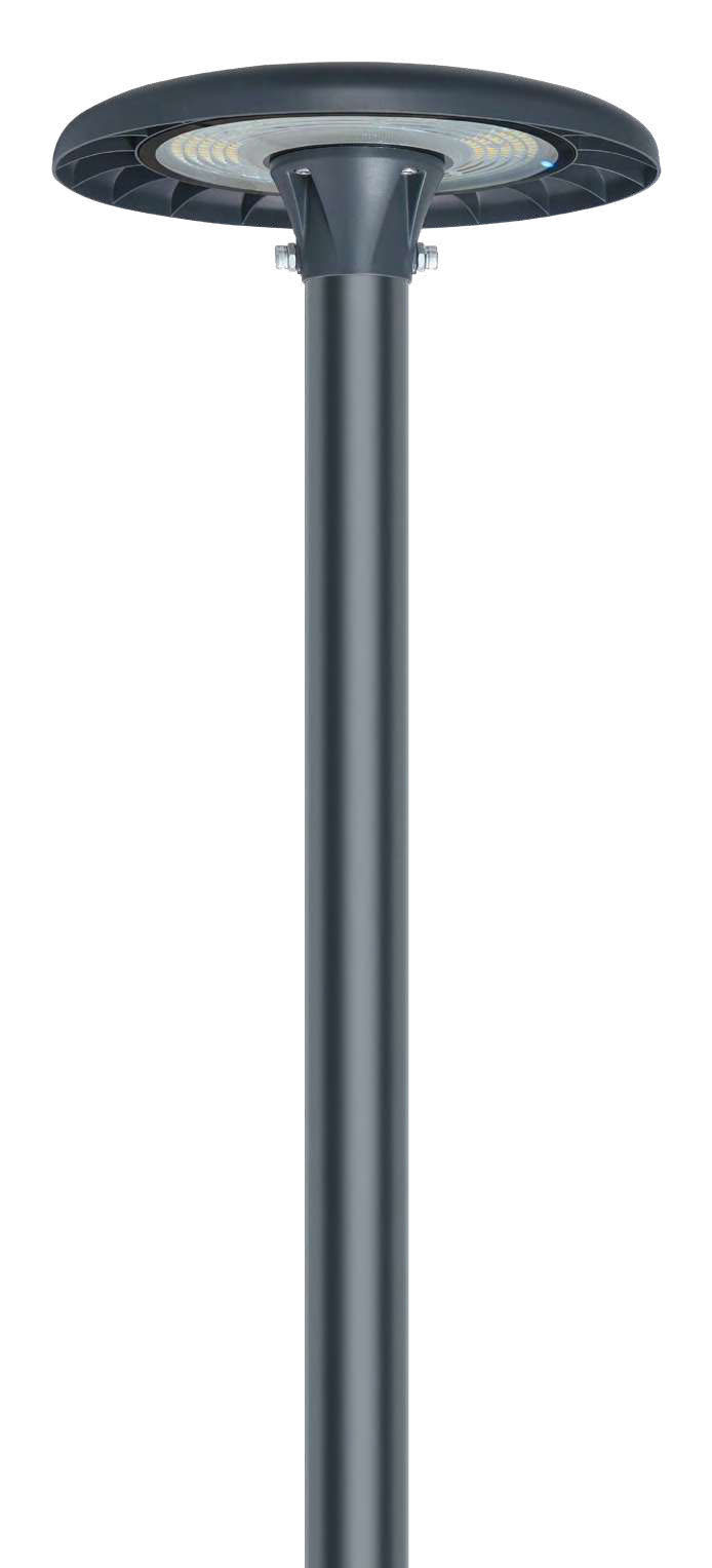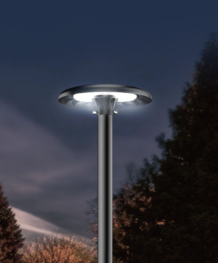 Veřejné parkové osvětlení, těleso hliník, povrch černá/šedá, LED 50W nebo přepínatelný příkon. LED 50-80-100W/80-100-120W, přepín CCT teplá 3000K/neutr 4000K/denní 5000K, Ra80, ULOR 2,3%, 230V, IP65, tř.1, rozměry d=382mm, h=117mm