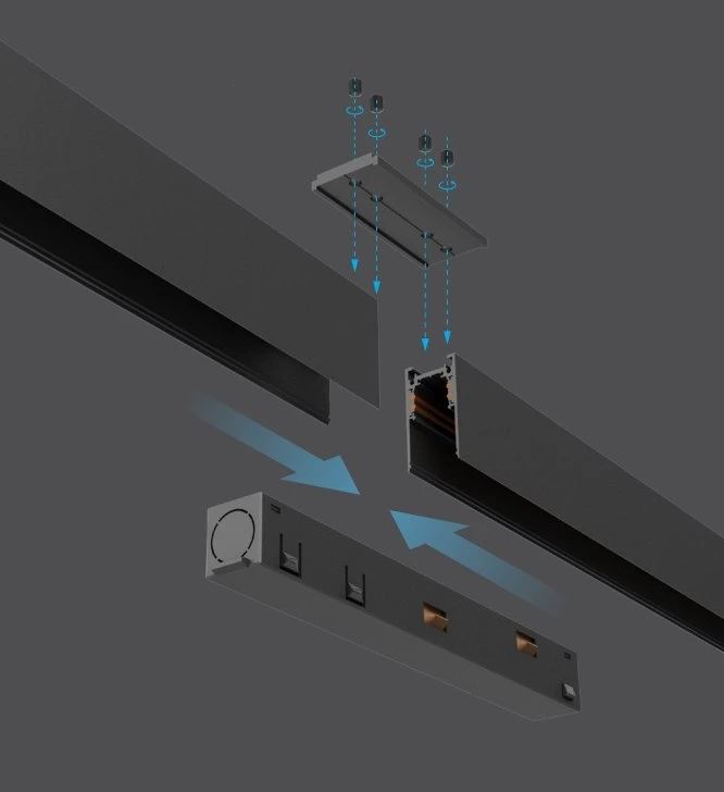 | Použití | Montážní základna je potřebná jak pro stropní přisazenou, tak závěsnou montáž. Základna se přišroubuje ke stropu, nebo se na ní zakončí závěsná lanka a na tuto lištu se připevní vlastní napájecí magnetická lišta |