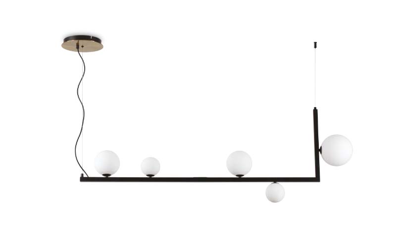 BIRDS - Závěsné svítidlo, lustr, základna kov, povrch mosaz a černá, dif sklo opál, pro žárovku 5x15W, G9, 230V, IP20, tř.1, rozměry 1355x455x200, vč závěs kabelu l=1600mm, lze zkrátit.