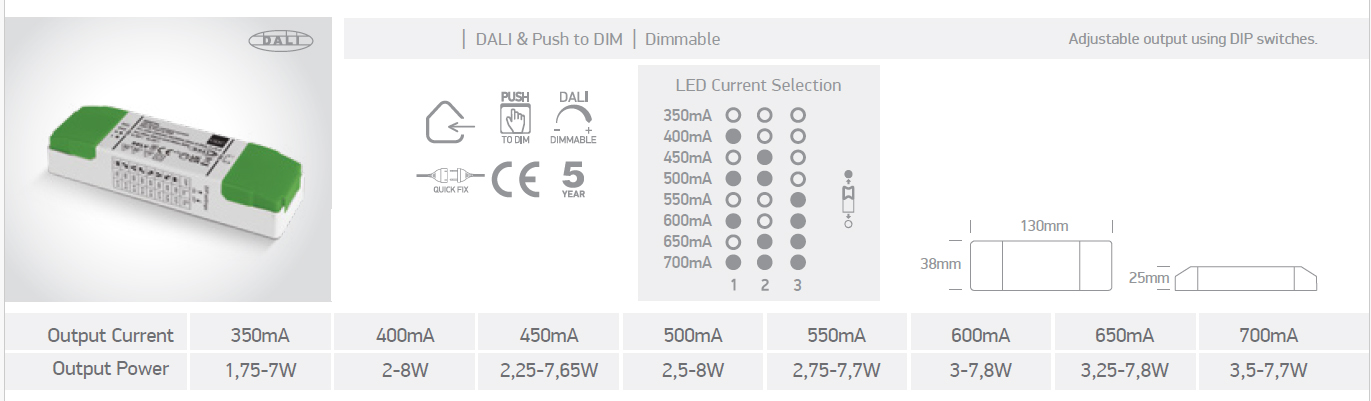| Pomocí DIP přepínačů nasavitelný. výstupní proud | 350mA: 1,75-7W, 400mA: 2-8W, 450mA: 2,25-7,65W, 500mA: 2,5-8W, 550mA: 2,75-7,7W, 600mA: 3-7,8W, 650mA: 3,25-7,8W, 700mA: 3,5-7,7W |