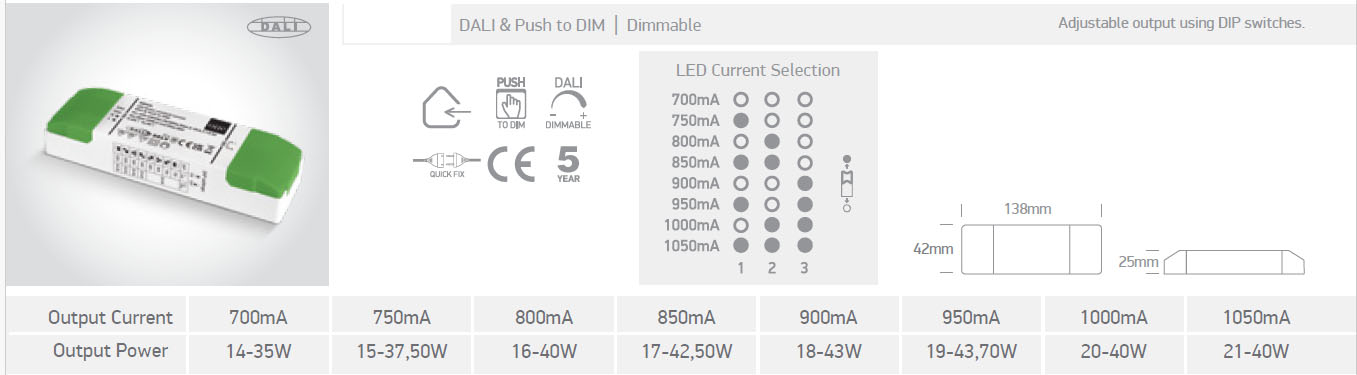 LED zdroj II DALI-PUSH 700mA-1050mA, 44W - Proudový zdroj pro LED, vstup 230V, přepínatelný výstup 700mA/750mA/800mA/850mA/900mA/950mA/1000mA/1050mA, 44W, stmívání DALI/PUSH, IP20, rozměry 130x25x42mm.