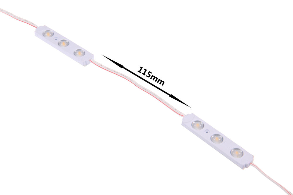 LED modul, pro osvětlení reklamy, LED 0,72W, teplá 3000K, denní 7000K, Ra75, vyzařovací úhel 160°, 12V DC, IP65, rozměry 74x15x8mm, rozteč modulů 190mm, délka vodičů mezi moduly 115mm