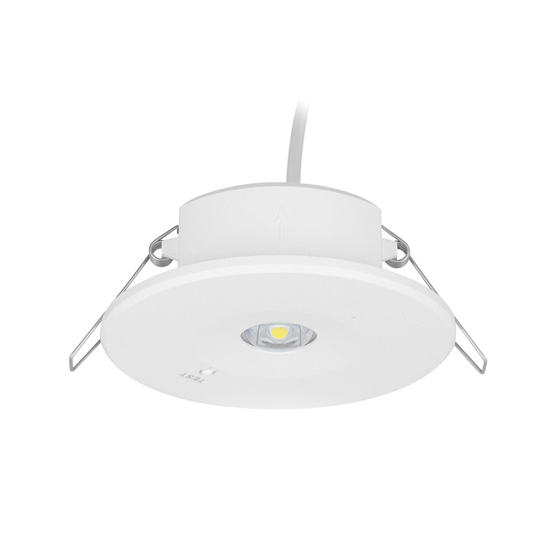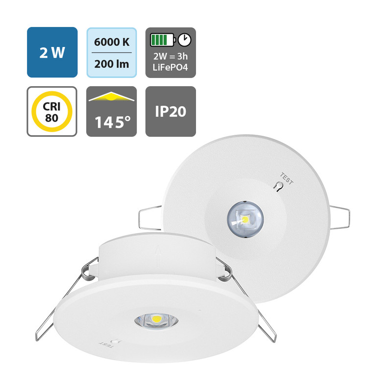 Vestavné podhledové nouzové svítidlo, plast černá, charakteristika OPEN AREA nebo CORRIDOR, SE - pouze nouzové svícení, LED 2W, 160lm, denní 6000K, záloha 3h, 230V, zvýšené krytí IP54, tř.2, d=98mm, h=43mm.