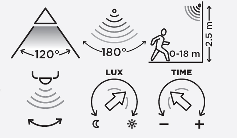 | Vybaveno PIR (princip na rozdílu teplot) čidlem pohybu, záběr čidla 120°, dosah až 10m, nastavitelný čas sepnutí 10s-10min, nastavení aktivace spínání po soumraku 10-1000lx, dosah čidla závisí na teplotě a velikosti tělesa (člověk, zvíře) v pohybu a pod | |