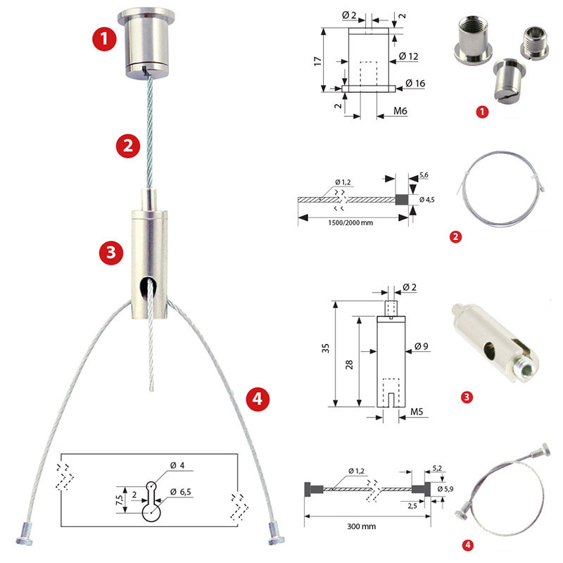 LZ02 Y, 1500mm - Stavitelný lankový závěs pro svítidla Y, materiál kov, nosnost 15kg, lanko d=1,5mm, l=1500mm, 1ks v balení