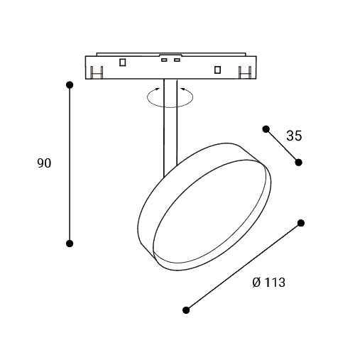 - Svítidlo do magnetického systému, nast. směr svícení, těleso kov, povrch černá, difuzor plast opál, LED 12W, 1000lm, teplá 3000K, 48V, IP20, rozměry d=113mm, h=90mm.