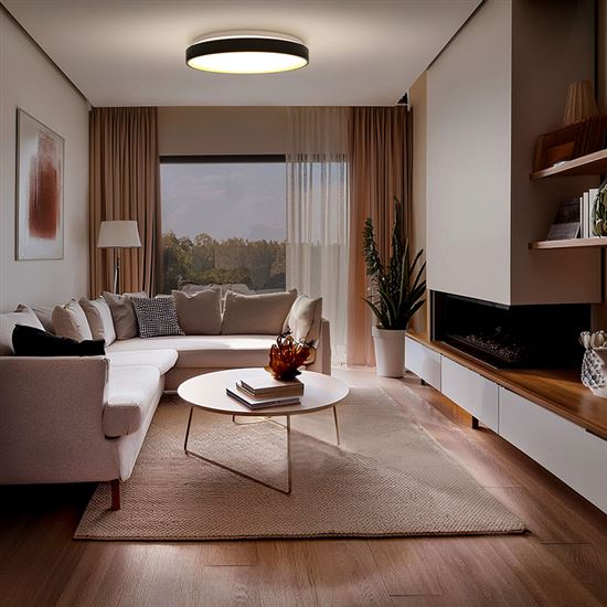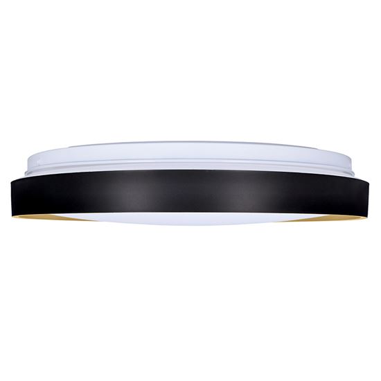 CALA - Stropní svítidlo, těleso kov a plast, černá, dif plast opál, LED 48W, 3360lm, dálk ovl. (součástí) lze nastavit CCT teplá 3000K - denní 6500K, stmív, 230V, IP20, rozměry d=380mm, h=65mm.