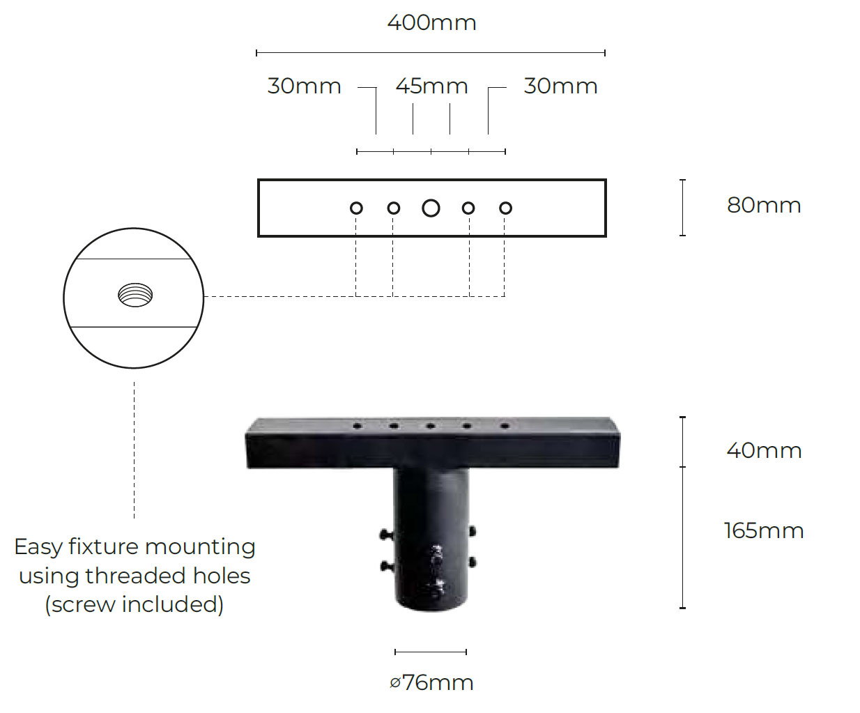 Držák svítidla stožár, materiál kov, povrch černá, rozměry 400x80mm, osazení na stožár d=60mm