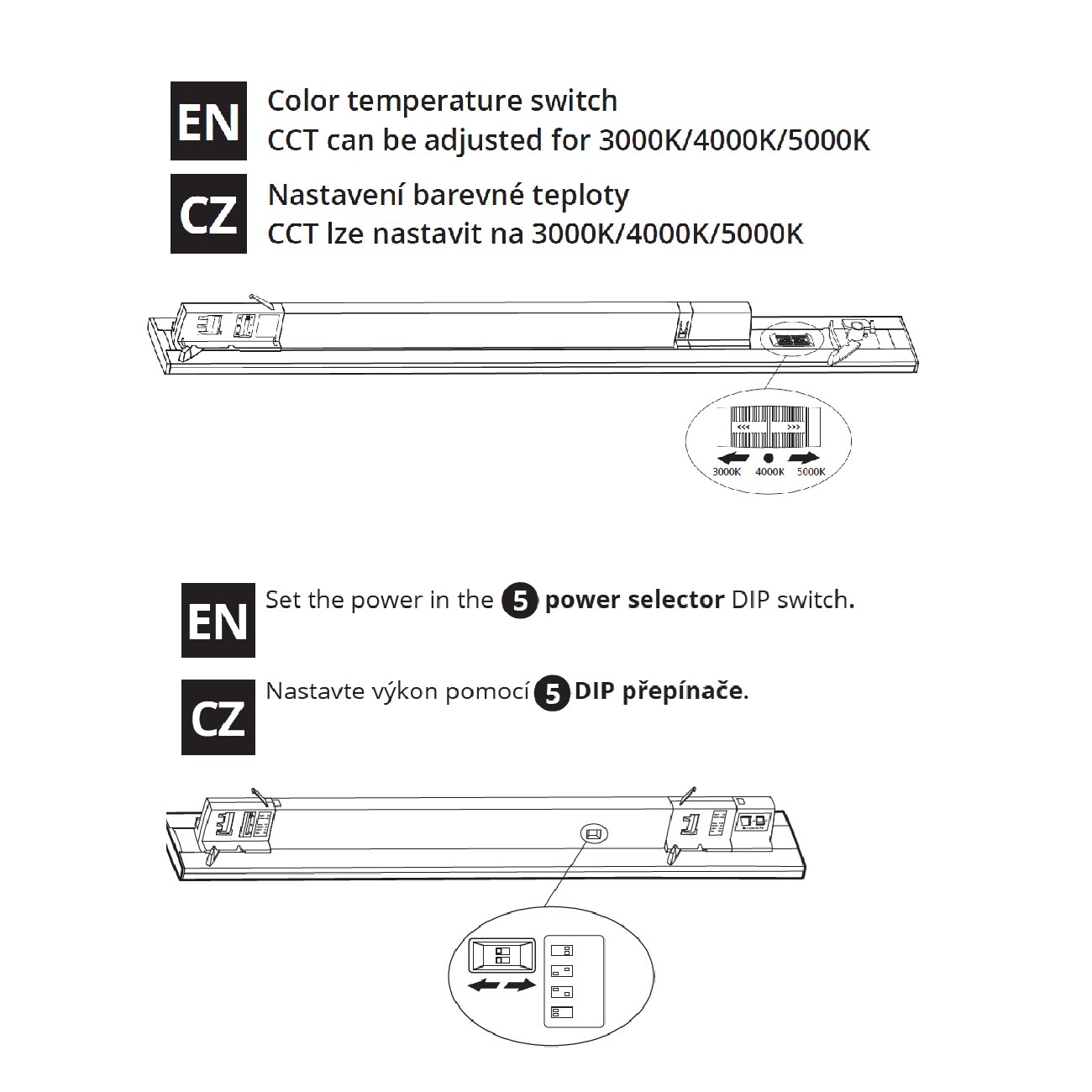 | Výhodné vlastnosti | Svítidlo je vybaveno přepínačem příkonu v rozsahu 60W/55W/50W/45W, přepínatelná teplota CCT teplá 3000K/neutrální 4000K/denní 5000K, vyzařovací úhel 120° |