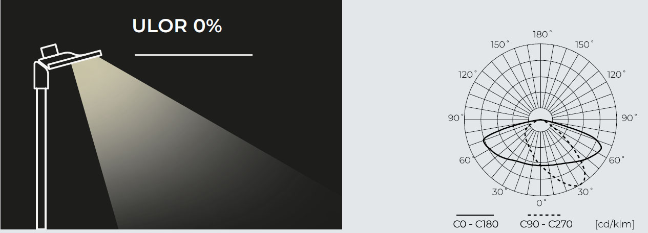 | Výhodné vlastnosti | Žádné světelné znečištění – svítidlo má faktor ULOR 0 %, což znamená žádné oslnění ani ztrátu světla. Montáž na stožár, nebo výložník |
